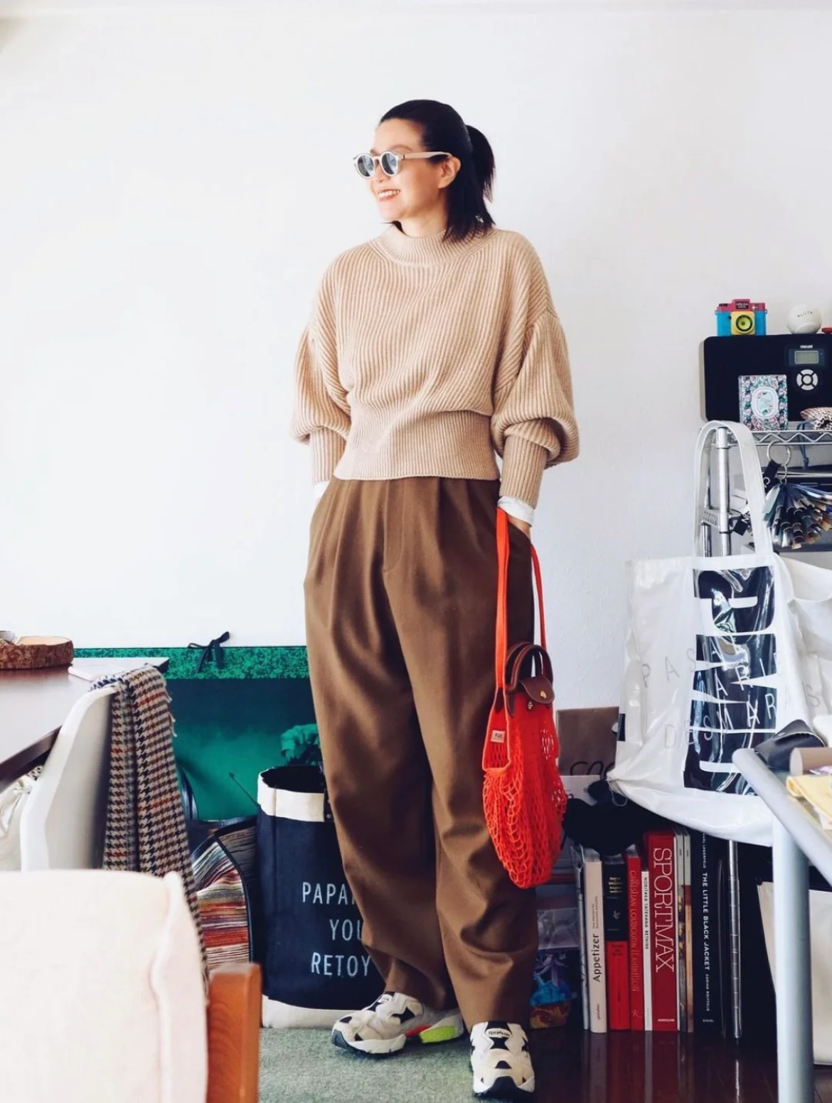 一件奶茶色的针织毛衣+长款西装裤,一个知性慵懒,一个洒脱大气,配合得风生水起,在如此碰撞下,女人的风格也有了多面性,她可以是闲适的优雅Lady,也能是职场追梦的干练女强人,整套Look没有石破惊天的美,却令人百赏不厌。