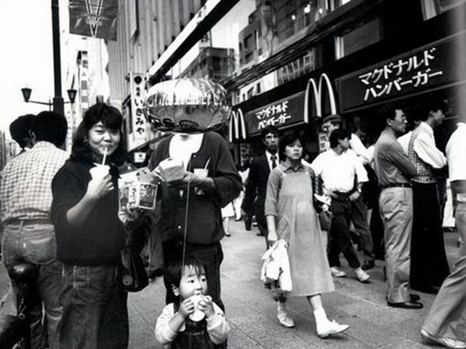 上世纪八十年代的日本城市街头,幸福的一家三口。“金拱门”在那时还是新鲜玩意儿,很是流行的。