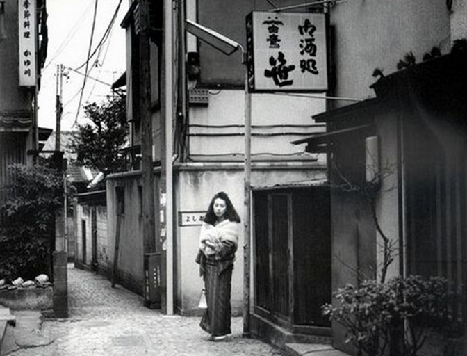 一名日本女性正站在胡同街口,似乎在等待着谁。