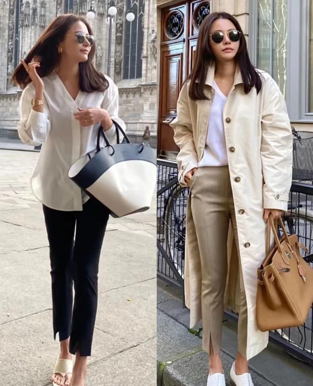 像上面模特穿的这种小开叉的裤子,设计感精致,虽然个性,但是在通身搭配上占比小,个性但是不夸张。