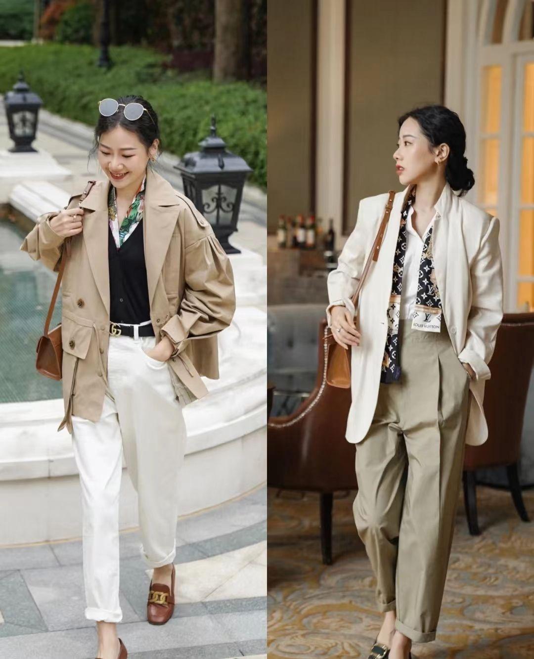 会穿搭的女性们,通常都格外注重穿搭上的细节和重点,想要将西装穿出女人味的话,可以尝试在颈部搭配一款花色的小丝巾,利用印花或者是碎花的色彩来呈现出视觉上的丰富感,与中性风的西装结合起来,整体的感觉既精致又不失职场上的利落感。