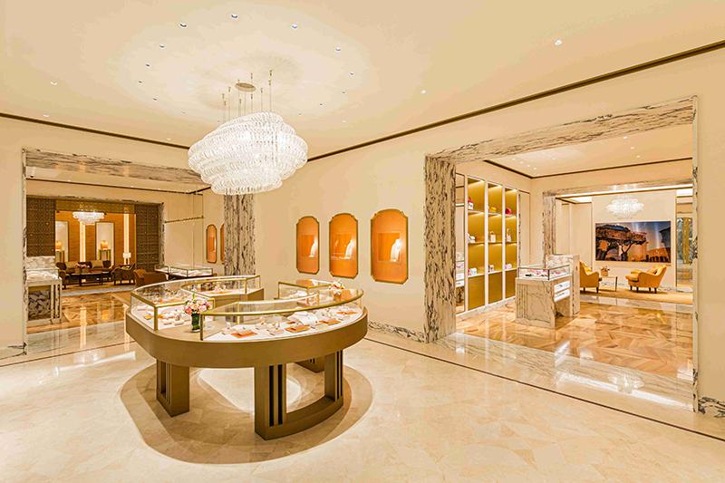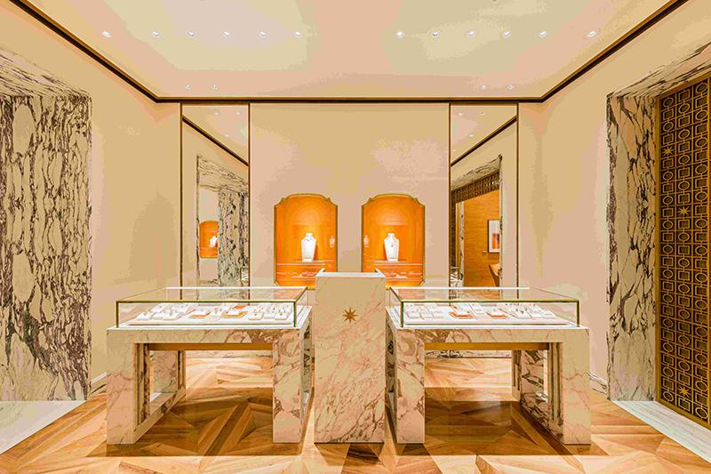 门店延续彼得·马里诺(Peter Marino)为品牌确定的门店风格和设计理念,大理石、古建筑元素、由圆形、正方形和八角星组成的几何图案“万神殿网格”(Pantheon Mesh)等悉数出现。门店提供了品牌珠宝、腕表和包袋产品,同时外立面的 5 扇盒中盒橱窗设计也值得留意。