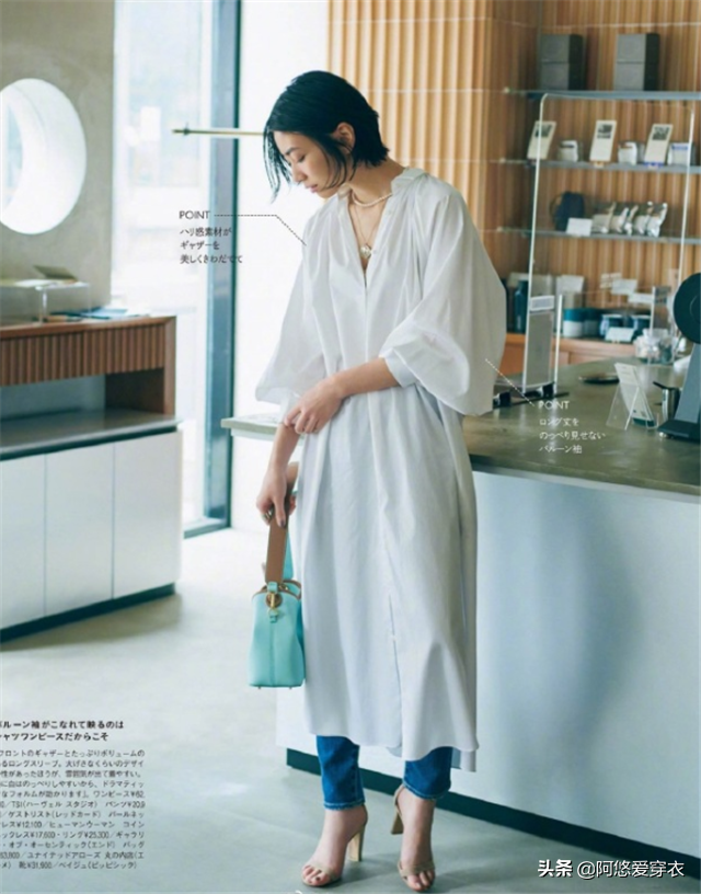 下面的白色衬衫裙装搭配牛仔裤,色彩清新, 减龄的果也很不错,适合日常搭配,具有很好的显瘦果。
