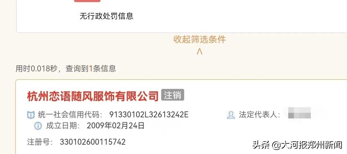 据此,记者查询到,杭州有一家“杭州恋语随风服饰有限公司”。