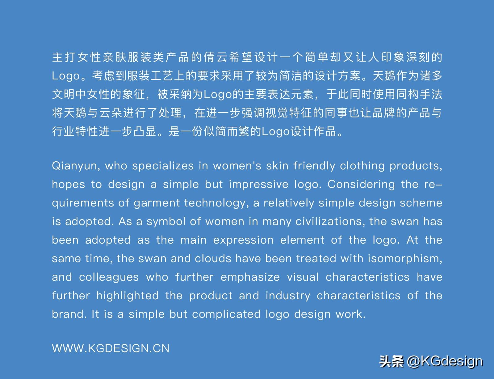 主打女性亲肤服装类产品的倩云希望设计一个简单却又让人印象深刻的Logo。考虑到服装工艺上的要求采用了较为简洁的设计方案。天鹅作为诸多文明中女性的象征,被采纳为Logo的主要表达元素,于此同时使用同构手法将天鹅与云朵进行了处理,在进一步强调视觉特征的同事也让品牌的产品与行业特性进一步凸显。是一份似简而繁的Logo设计作品。