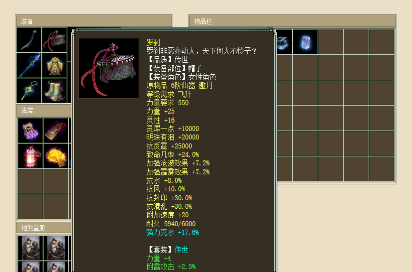 帽子同样也是6阶仙器,蓝字炼化强力克水17.6,虽然不是满值,但是不算太低!让小苏有点纳闷儿的是,套装选择方面玩家居然打上了“罗刹”,估计是随便找了一件传世玉符,为了套装属性可以洗出更高的数据吧,不然龙族没必要专门打造“罗刹套装”,更何况只有一个部件也没有具体果。