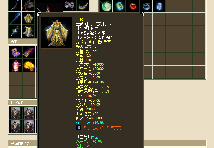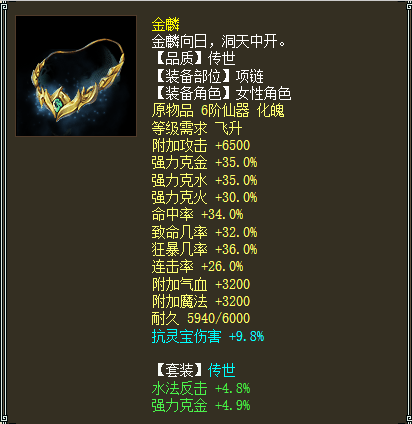 衣服同样也是6阶仙器,蓝字属性克水16以上,也还算不错。套装选择“金鳞”目的很明确,三件“金鳞”套装就可以激活被动技能“如鱼得水”,进入战斗之后可以给自己直接加上“牛法”状态,提升伤害之余,还省的魔族浪费一回合出手。