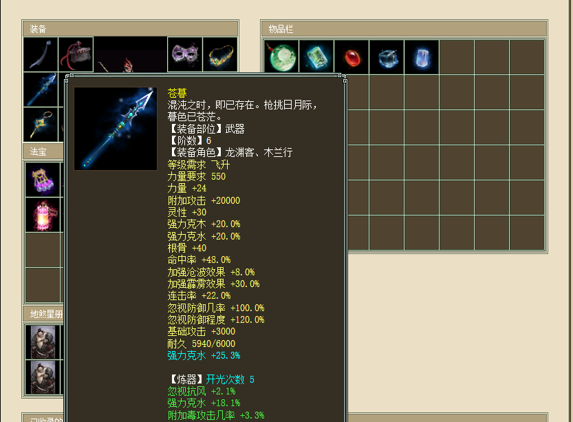 武器选择的是6阶破物理“苍暮”,忽视防御程度120,忽视防御几率100,抛开这些基础属性不说,蓝字炼化强力克水25.3,以及开光炼器强力克水18.1,都算得上比较高的数据。当然也有玩家觉得炼器属性里加成攻击要比强克果更好,这取决于整体装备搭配,某些时候拥有高克属性,终伤害并不亚于高攻击的玩法。