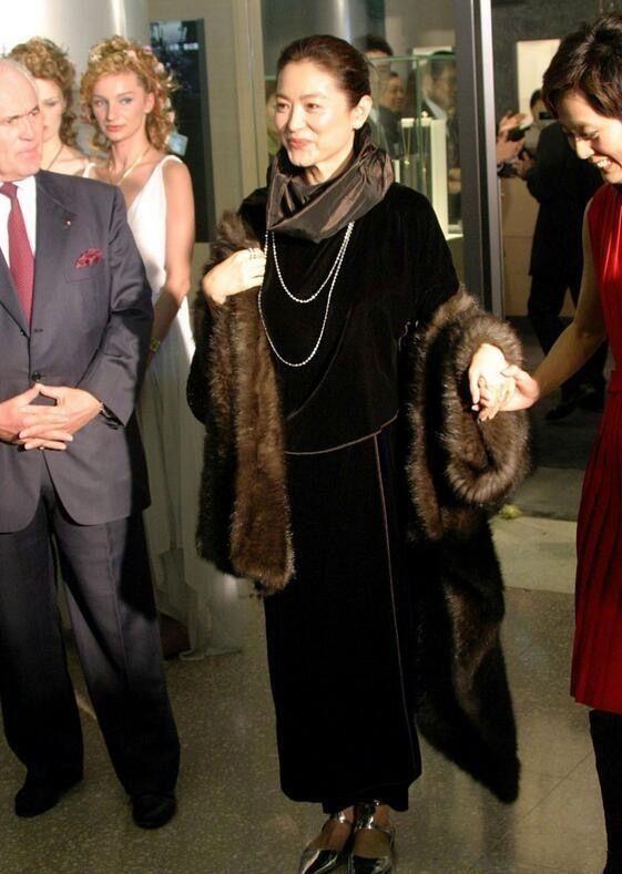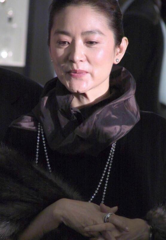 林青霞将重点单品放在了皮草披肩上,而黑色的丝绒连衣裙则作为辅助性单品,其实这种重点转移的穿搭手法,还是很值得气质女性去借鉴的,丝绒材质柔顺光滑,能够呈现出一副高级质感,垂坠感十足的果更是对于身材线条美的展现,搭配上毛茸茸的皮草披肩,减少了丝绒的厚重感,整个人显得华丽又高雅,尤其是整体深色调的搭配,避开了廉价感和显老的影响。