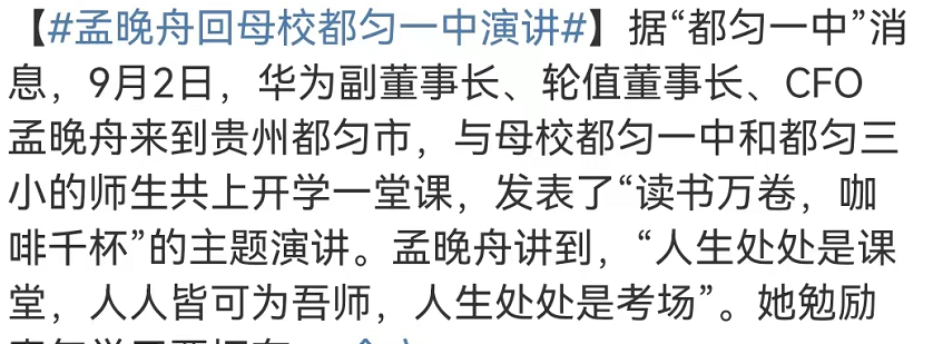 近日,孟晚舟就高调回到母校都匀一中,并且为都匀一中跟都匀三中的师生们真诚发表了“读书万卷,咖啡千杯”的主题演讲。