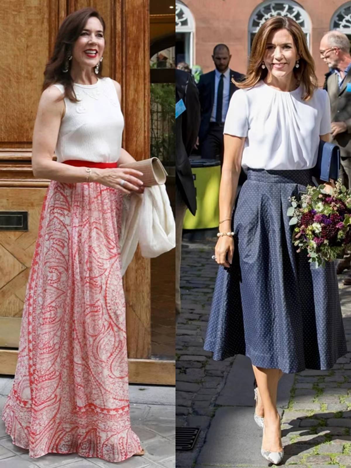 这一搭配在玛丽王妃的造型中出镜率很高哦,我们还可以学学她,通过外搭西服提升干练感。