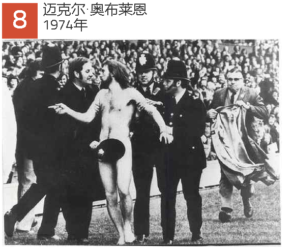 在重大体育赛事上的第一位裸奔者,还拍摄了有史以来的裸奔照片。这张照片由伊恩·布拉德肖(Ian Bradshaw)拍摄,是《生活》杂志的“年度图片”,还获得了世界新闻摄影奖。《人物》杂志将其命名为“十年的图片”。这张照片摄于1974年2月在特威克纳姆举行的英格兰和法国之间的橄榄球比赛中。在中场休息期间,迈克尔·奥布赖恩(Michael O'Brien)赢得赌注,赤裸裸地跑到场前有包括亚历山大公主在内的48,000人。第二天,他失去了工作,并被罚款10英镑,这是他在自己的投注中赢得的确切金额。奥布莱恩现在是一位受人尊敬的墨尔本商人,从不为自己的绝技而骄傲。在避开新闻界32年之后,他终于同意在2006年接受采访,奥布莱恩(O'Brien)在澳大利亚电视节目“他们现在在哪里?”中说,他认为在体育赛事上裸奔是一件愚蠢的事情,他对开始这种趋势感到遗憾。奥布莱恩还说,当时的比赛中没有电视摄影机,如果不是布拉德肖的照片,公园里只有48,000人,没人会知道。