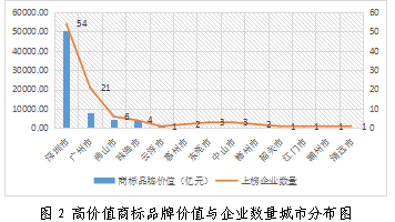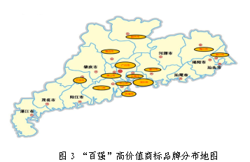 此外,广东上市公司高价值商标品牌百强企业具有区域上的空间聚集应。从图3中可以看出,珠三角地区上榜企业所在地区分布集中,以深圳、广州为中心,呈放射状分布。