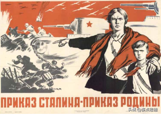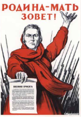 弗·谢洛夫的《斯大林的命令就是祖国的命令!》画中的祖国母亲直指战场,并向苏联民众告知服从斯大林的命令的重要性。这位面容严肃、神情坚定的母亲让观众都能从内心审视自己,是否为保护祖国力。《斯大林的命令就是祖国的命令!》是卫国战争时期祖国与政党结合的经典作品,旨在敦促民众在斯大林的指导下共同抗战。