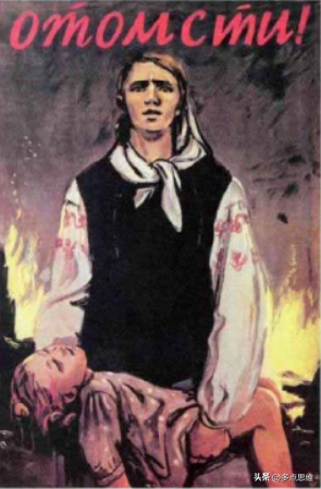 德·什马利诺夫的《复仇!》呈现德占区受难苏联公民的代表作之一。在枪林弹雨的战场中,一位母亲抱着女儿的尸体痛哭,她的面容中表达出的不仅是痛苦,还有复仇的强烈愿望。上方红色大写的 “复仇!”在唤起人们对战争仇恨的同时,也激发观众尤其是前线士兵的杀敌欲望。