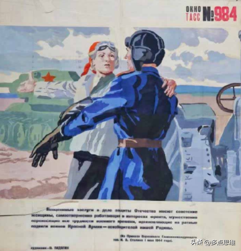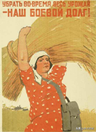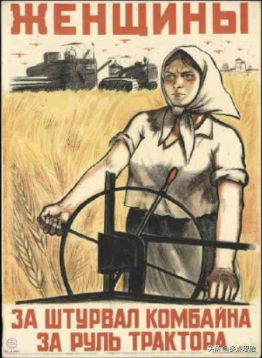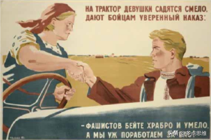 在画作《姑娘们勇敢地坐在拖拉机上,坚定地告诉战士们:勇敢杀敌!我们会为你们工作!》中,画家尼·阿夫瓦库莫夫描绘出一位农民姑娘与即将要出发上前线的士兵告别的场景,她郑重地向士兵:“她会一刻不停地劳动,以此向前线提供更多的粮食”。这位姑娘坚定的目光和手中熟练操作的方向盘示意她能够光荣地完成农业生产的任务。这幅作品中展现出农村姑娘是战时苏联农村女性的缩影,也透露出替代家中男性完成劳作任务是战时苏联后方妇女的共识。
