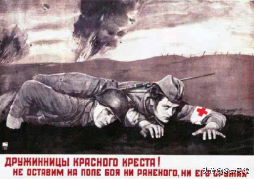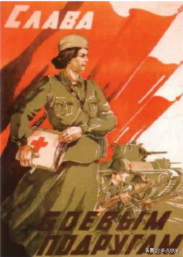 卫国战争时期前线的医护力量不仅仅来源于医学院,红十字会也是展示培养医护人员的主要机构。在科列兹基的《参加苏联红十字会和红新月会的护理培训!》中,一位女红十字会医护人员正在对一名伤员护理,画中女性展现出的专业、耐心和温柔等特征唤起了女性观众的爱国情怀。在画作问世后,大批妇女响应的号召,来到红十字会学习。红十字会的培训相对简单,对应征人员的限制也较为宽松。妇女们在学习基础的护理知识后,奔赴战场,成为前线战场上的“救助天使”。