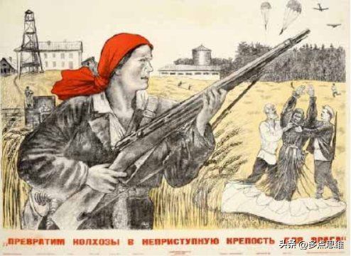 在祖·多克托罗夫的画作《把集体农场变成敌人不可攻克的堡垒》中,一位女战士头戴红巾,手持冲锋枪望向远处空降的德国伞兵。画面右边的老人和孩童正在制服一位德寇。画作展示出在集体农庄里的男性上前线战斗以后,留下的女性和承担起了保家卫国责任的画面。画作突出女游击队员的英勇形象,也由此呼吁更多女性参与到游击队的战斗中。