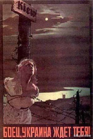 维·克里马申的《战士!乌克兰等着你!》创作于1943年基辅会战前。画家绘制出一名女性受辱的场景,女孩被敌人绑在乌克兰的母亲河——第聂伯河河边的柱子上,柱子上方的公告牌上印着德文“Kiew”(基辅)表示乌克兰已经被德军占领,这是对苏军的挑衅和示威。这幅画作被张贴到前去乌克兰战场的坦克的装甲上和解放基辅的路上,画中女孩绝望地向红军战士们求助,希望他们加快解放被占领地区的脚步。