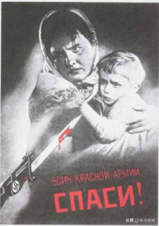 在维·科列兹基的作品《红军战士,救救我们!》。一支带着纳粹标志的刺刀正在威胁着一位年轻的母亲和她的孩子,母亲没有表现出一丝畏惧,反而表现出随时与德国人拼死战斗的坚定。科列兹基在谈到这幅作品时说:“母亲的眼睛才是这幅画动人之处,母亲和孩子的眼神没有看向血淋淋的刺刀,而是恶狠狠地瞪着敌人,母亲眼神传递给观众的是对敌人的蔑视和憎恨和对红军战士的求救。”