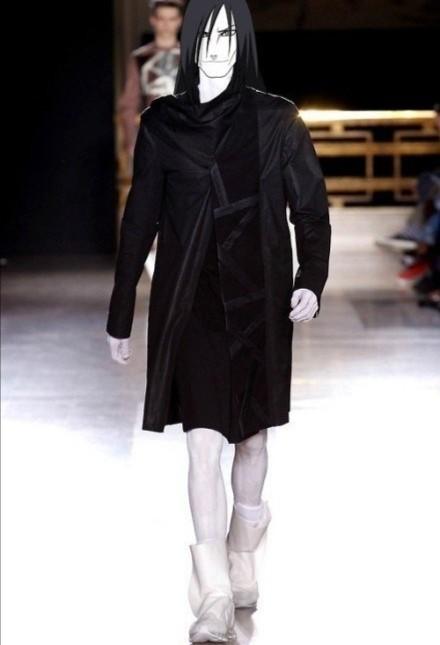 后再来看看大蛇丸吧。大蛇丸喜欢玩换身的把戏,很多人都难以分清他的性别,就连对他的称呼也是模棱两可的。有的人称呼他为“蛇叔”,也有人称呼他为“蛇姨”。就大蛇丸在t台上的走秀来看,也的确是兼备了男性和女性的特征。一套黑色的大衣,配上白色的靴子,单纯看上半身觉得还很男性化,可是看到靴子后,却显得有些出戏。