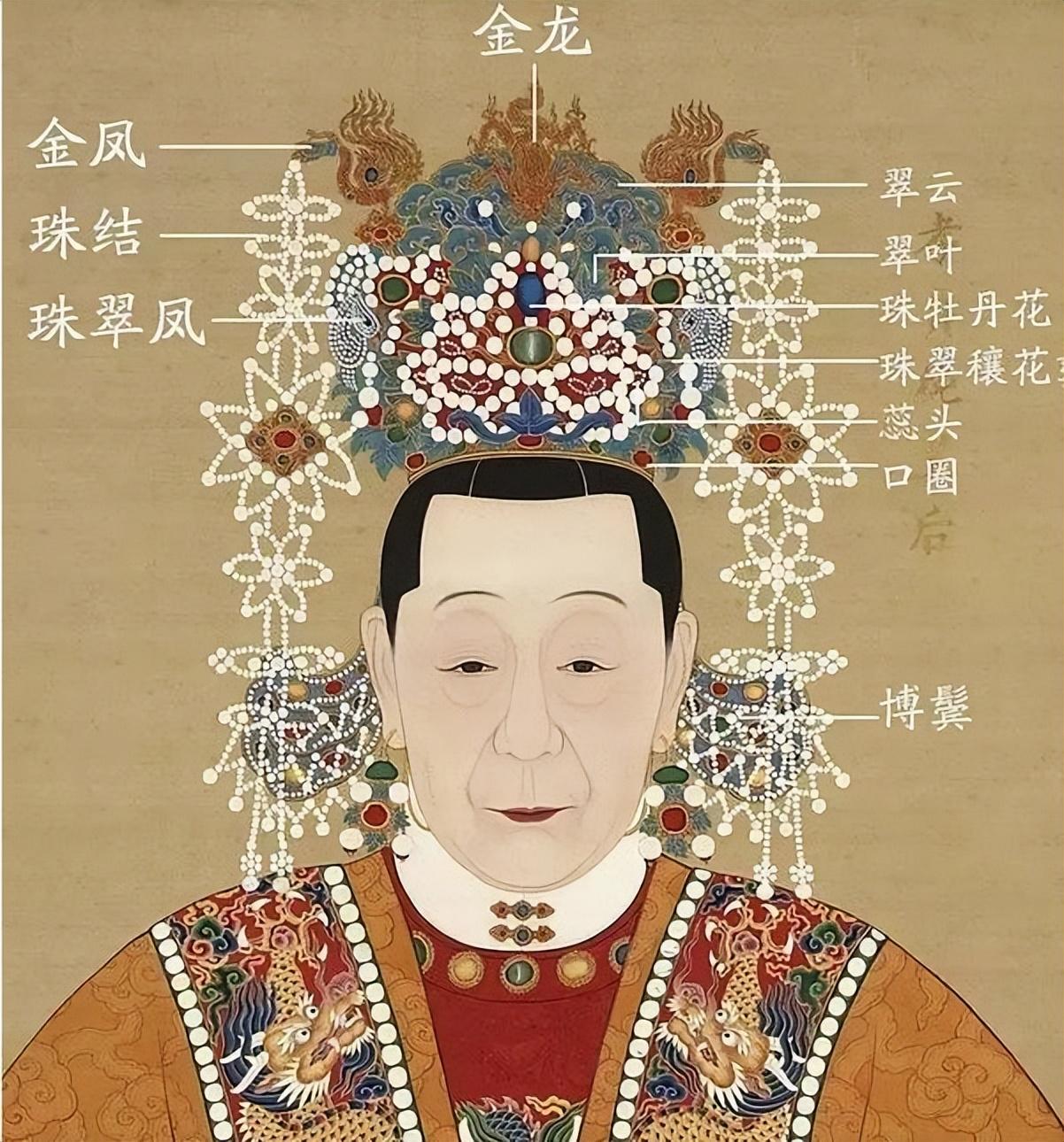 我们以下面的图片为例,来看,冠饰细节的组成部分:金龙、金凤、珠结、珠翠凤、翠云、翠叶、珠牡丹花、珠翠穰花、蕊头、口圈、博鬓。