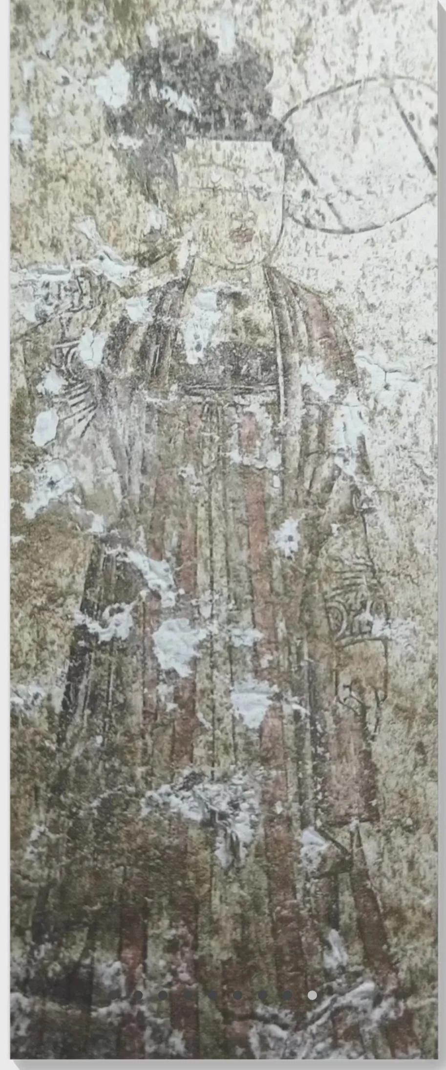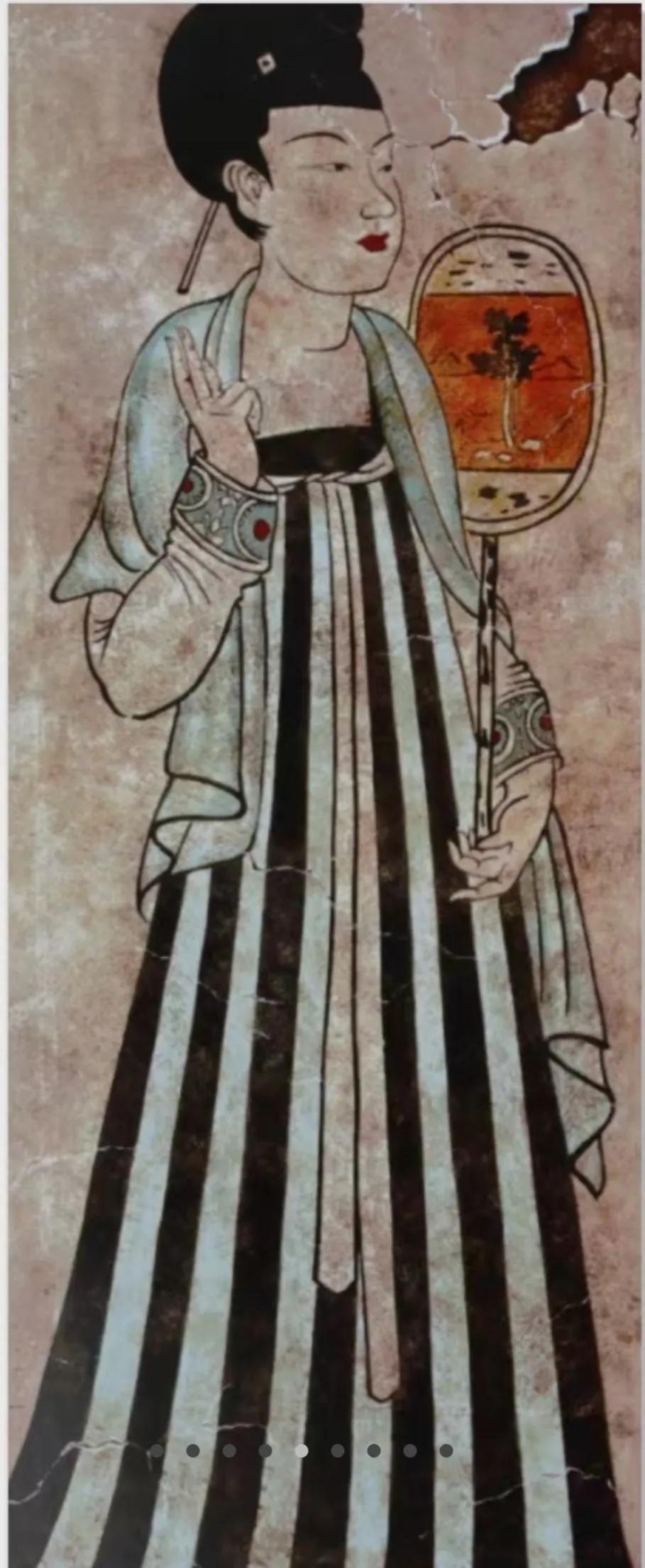 这些仕女图与群侍图都是以唐代仕女图像来描绘的,大致的从画面的整体果来看,颜色基本保留了原有的艳丽,每一幅作品在用色上也比较讲究,特别是初唐时期女性喜爱的线条相间的长裙,隋代遗留下来的窄袖衫加上西域流传过来的披帛,再加上初唐时期并不是以胖为美的审美要求,仕女们都是高挑的身材,瘦削的溜肩,细长的脖颈,高耸的发髻,配上精致的步摇,拖曳的长裙,走起路来像是轻轻的在飘逸,确实是唯美的少了很多人间烟火气息。这要感谢这几幅壁画的画匠们精湛的画工,对人物每一个细节的描述都是独具匠心的,比如对仕女们发髻的描述,虽然采用平涂,但墨色浓淡相融,很好地反映了发髻的层次感。对衣裙的着色上,以晕染为主,较少平涂,使画面显得淡雅静谧。对头饰步摇的点睛之笔更是绝绝的惟妙惟肖。