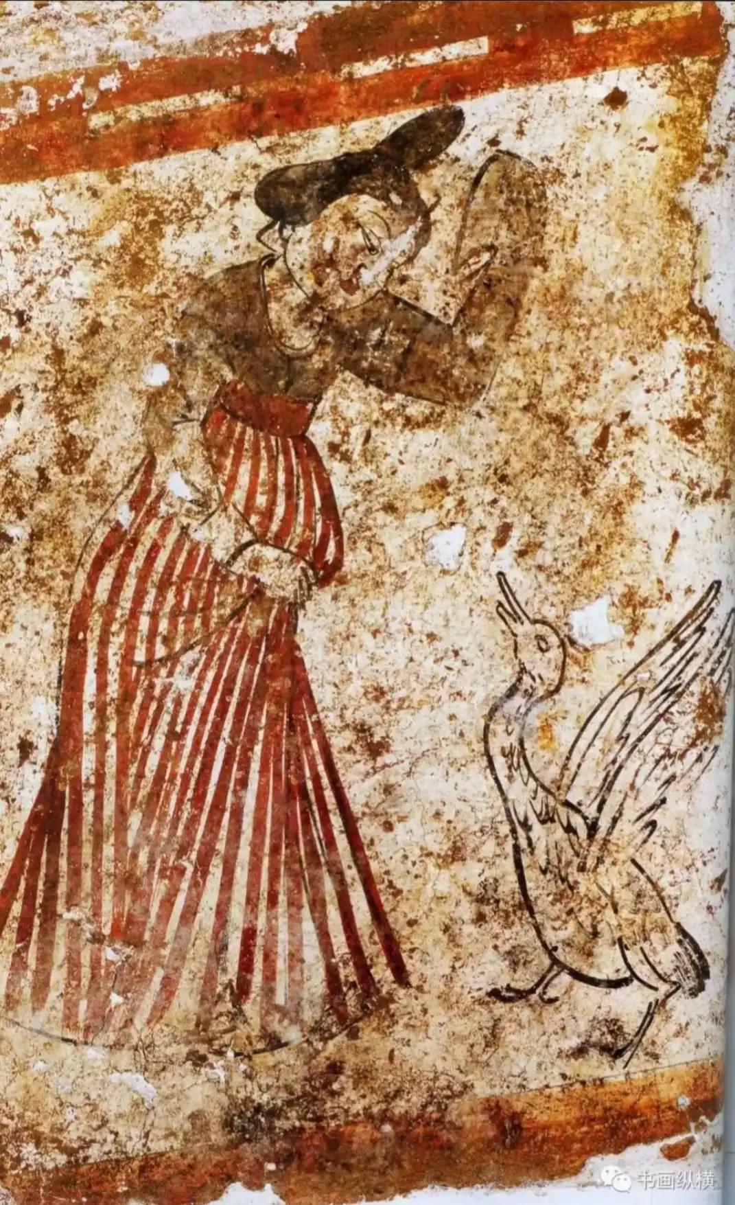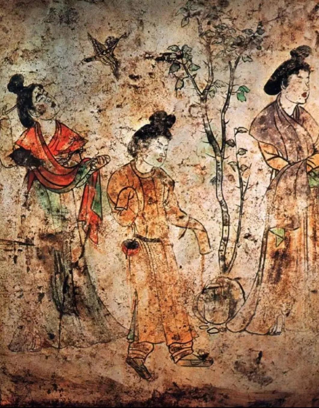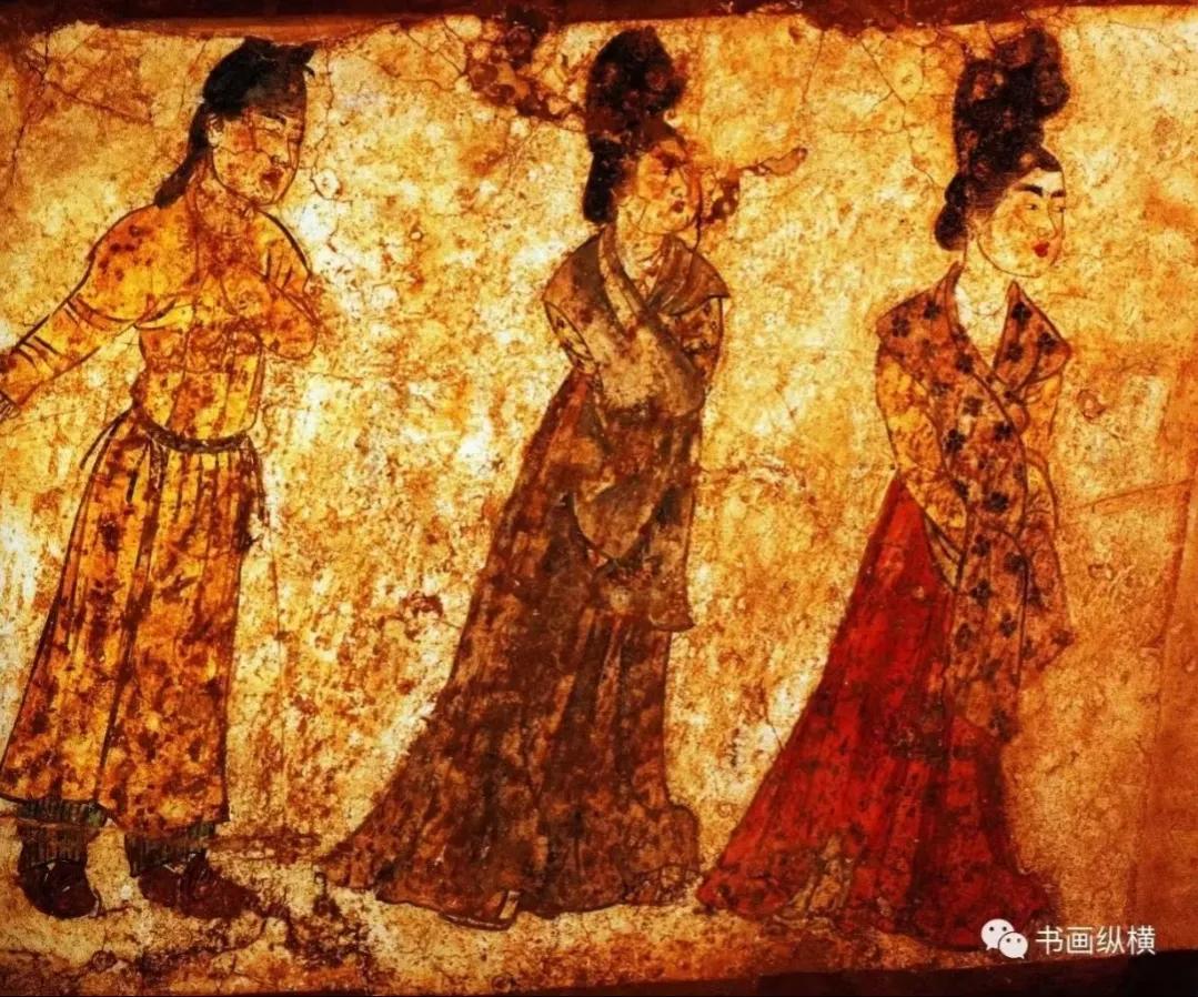 这些图像是陕西礼泉唐太宗李世民的昭陵博物馆展出的唐代段簡壁墓葬墙壁上揭取的壁画,虽然经年累月的在墓葬里封存了一千多年,壁画的剥落有的已然模糊不清,但是从色彩上,壁画本身的人物造型上还是能感受到大唐那个时代仕女们的优雅气质与婀娜飘逸的风韵,反倒让这斑斑驳驳的壁画有了一种生命感和亲切感,有了一种让我穿越回大唐盛世的激动,无论是人物还是服饰,都是新鲜的活灵活现的近距离的美,令我们现代人心生艳羡。