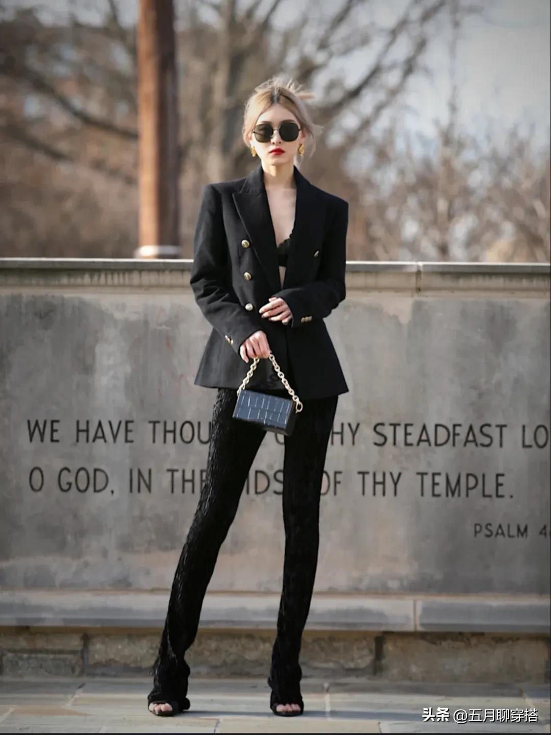 第3身看起来很霸气了!不喜欢的穿裙子的话可以选择蕾丝胸衣十西装外套十丝绒长裤的穿法,气场十足!