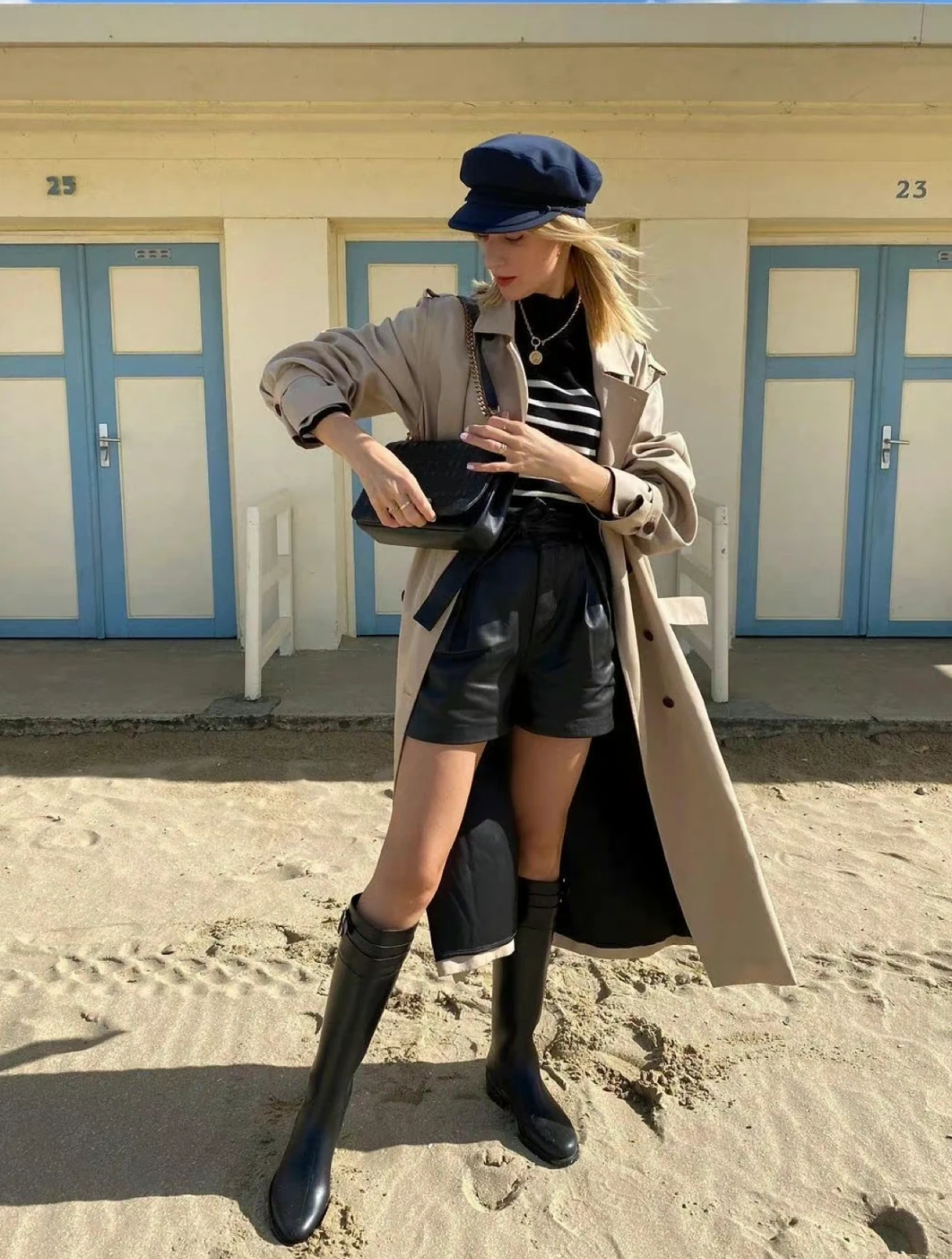 长外套+短裤+马靴的穿搭模式适合小个子,在穿着时,好下半身的色彩统一,没有割裂和分层,会更加修饰腿部曲线。上图这套Look,将厚实的大衣替换成了长风衣,又酷又飒的格调手到擒来,皮裤和长靴了独立帅气的美感的同时、也尊重女性身材曲线的显露,让穿着者可以带着优雅与锋芒的气质行走在城市之中,令人一见倾心。