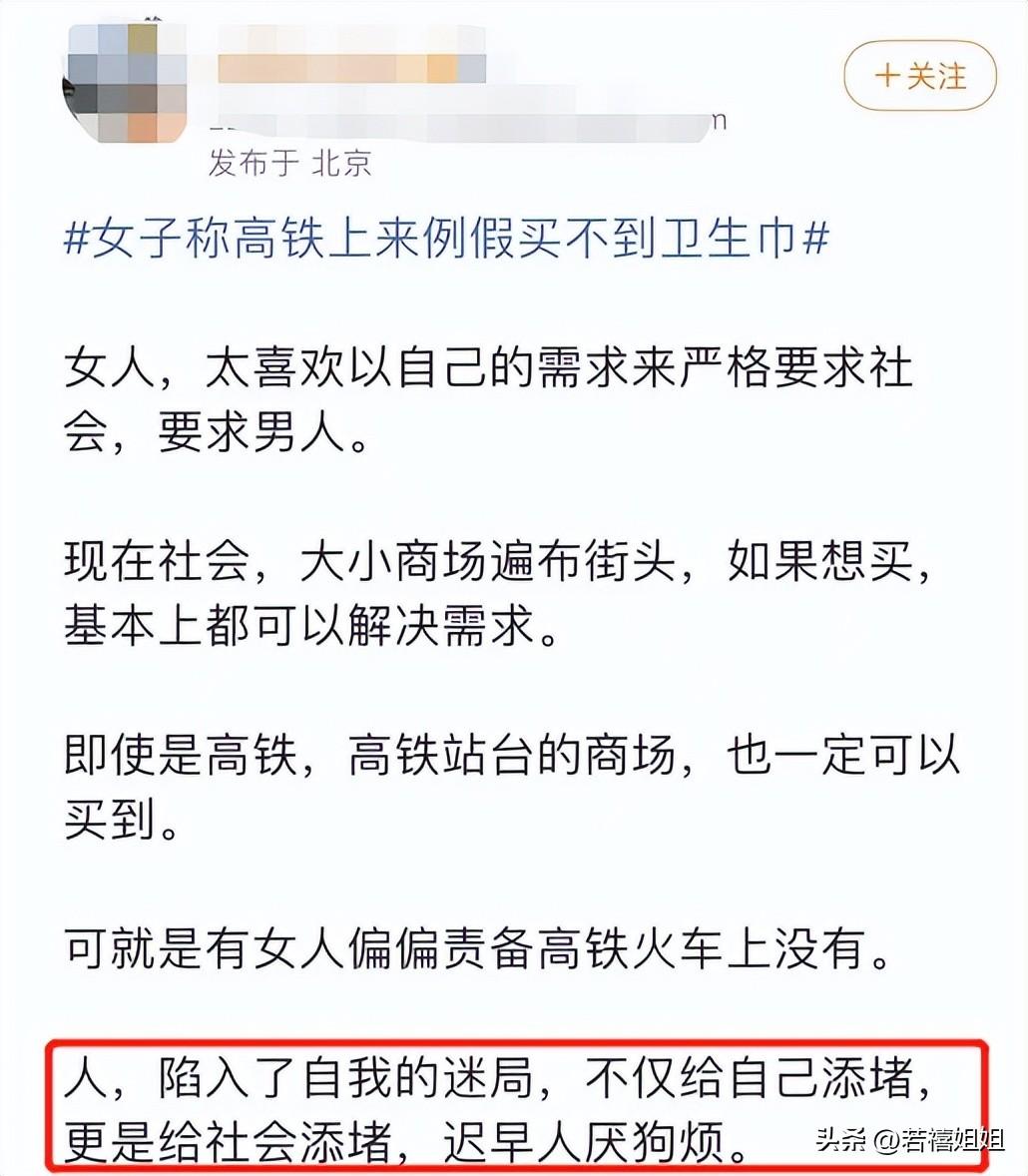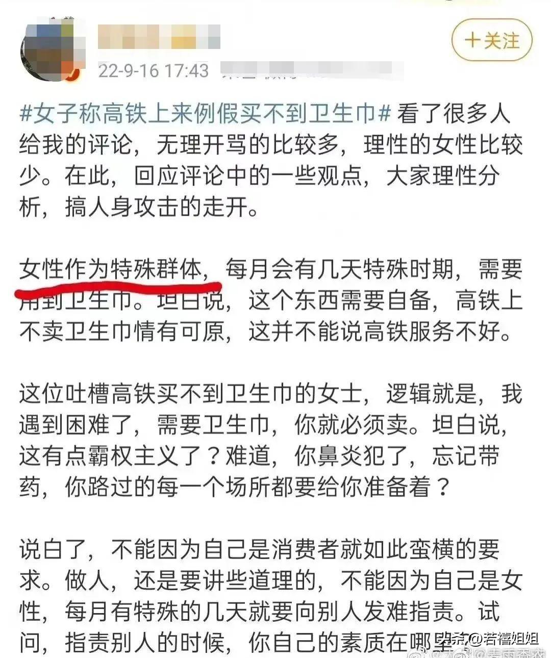 因此,女性建议高铁上卖卫生巾才会受到这么多的攻击。