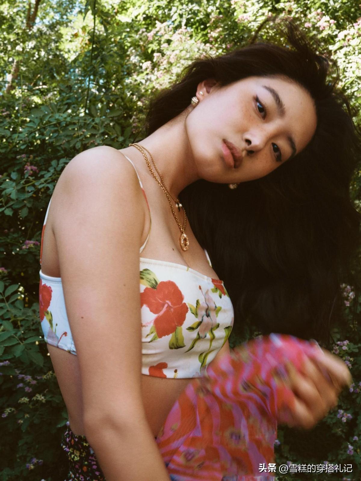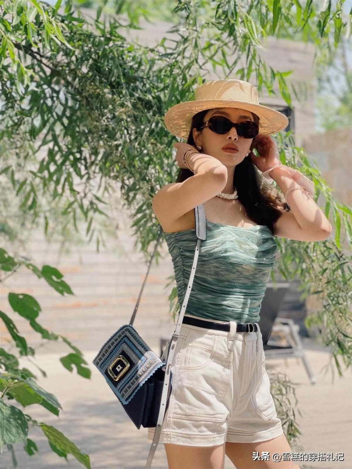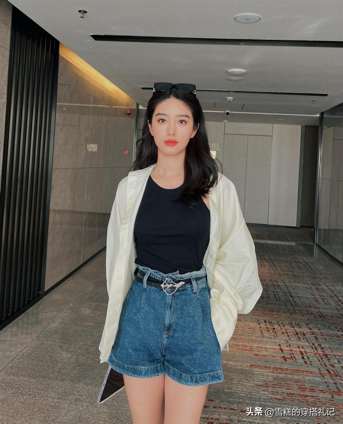 a颜色组合,求省事的姐妹可以选同色系,顺色系,想要变化感丰富的可以选多花色配纯色。像杨采钰小姐姐这样以米白色短裤为基础,搭配水流纹质感的吊带上衣,上繁下简,层次分明。中间还可以增加黑色腰带,这样造型感会更立体。