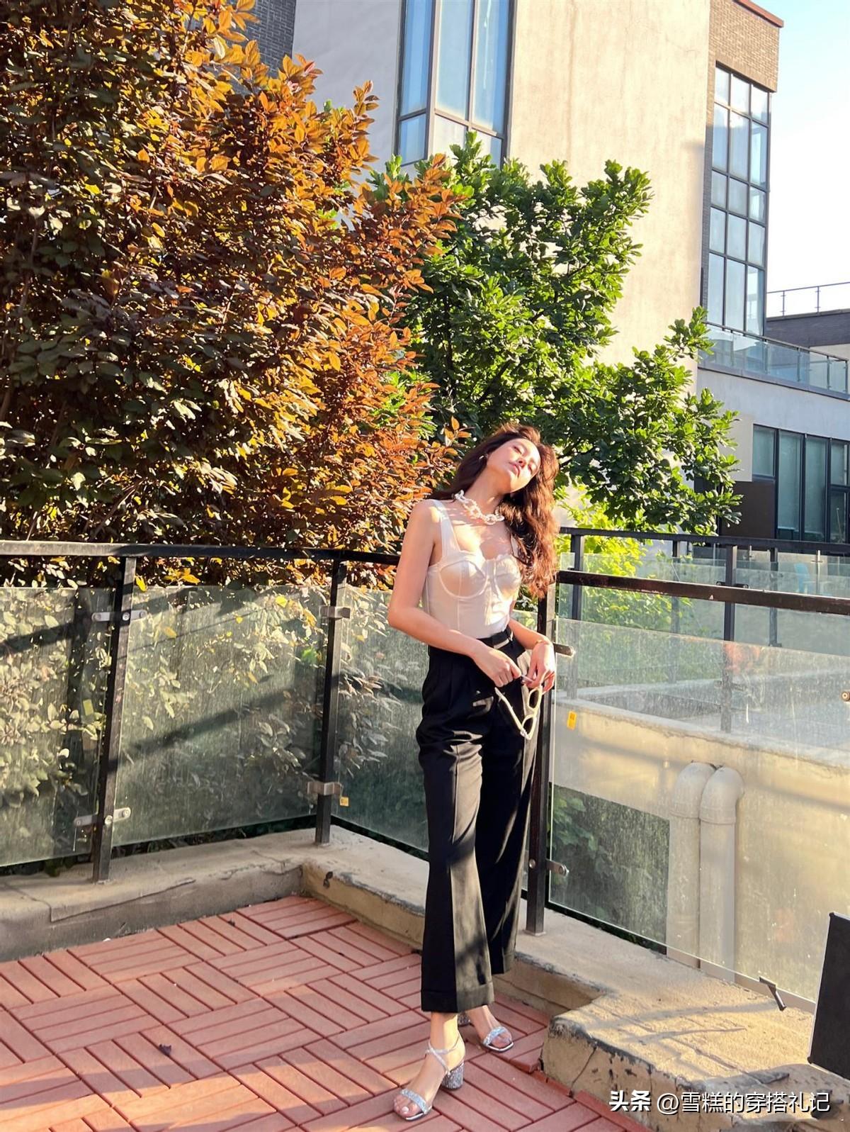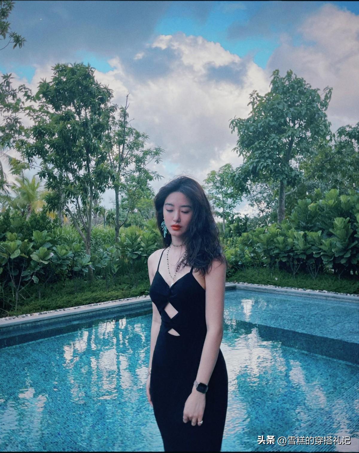 学着杨采钰小姐姐这样,选一件纯黑色的吊带连衣裙,在腹部加入几个镂空的小设计,让整体不至于太过沉闷,同时搭配比较吸睛的耳环,叠加的项链等,帮助暗色系造型提亮。