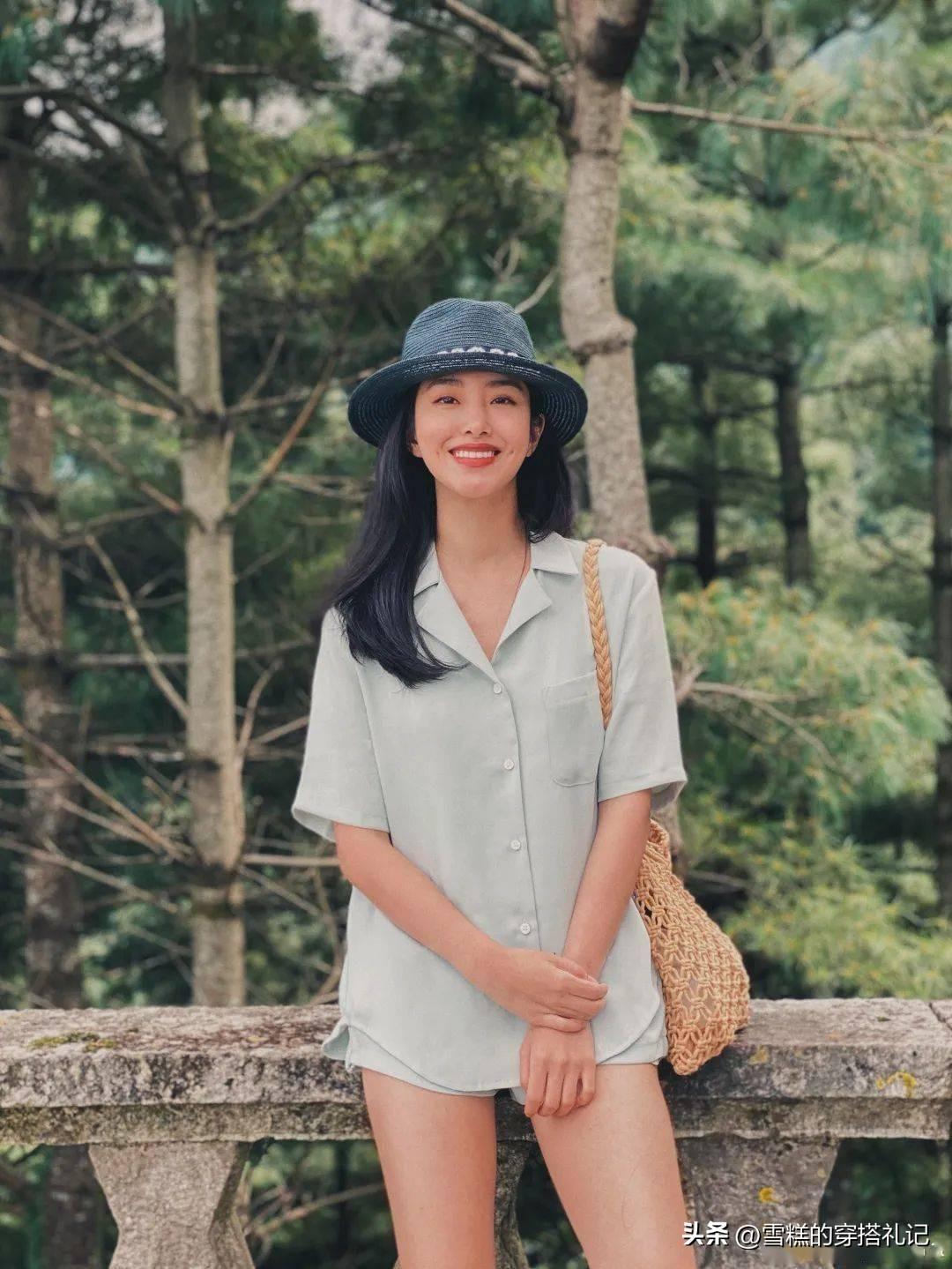 比如杨采钰小姐姐这一身,纯色的衬衫短袖,搭配同款短裤,上下的长短错落,给人一种“睡衣”风的感觉,而搭配的宽檐帽与编织包包,又让造型变得更有设计感,将整个人又拉回“时尚圈”,不至于过度随意。
