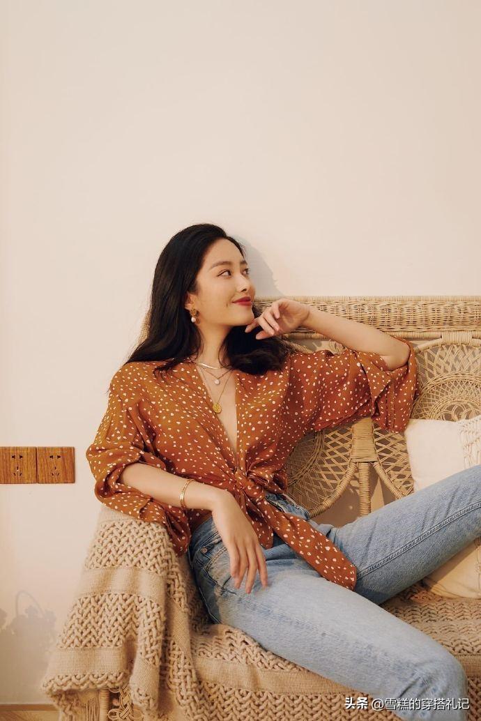 这种风格的造型在杨采钰小姐姐的穿搭中,总会以标志性的元素体现,例如这个造型中的波点、牛仔。作为经典系列的他们,配合咖色、浅蓝色水洗的色调,将复古感呈现,同时匹配好发型和妆容, 专属也八九十年代感的摩登美人就是你啦~