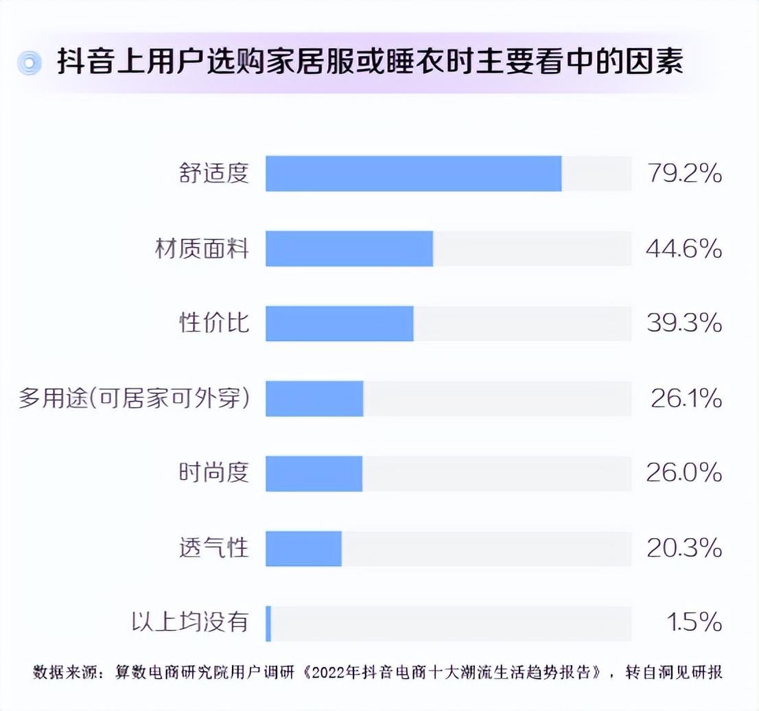 数据显示,在周末宅家的用户中,89.0%会在日常居家场景中穿着家居服。超过45.0%的用户拥有3件及以上的家居服。而穿着家居服的人中,79.2%在选购睡衣或者家居服时更看重舒适度,44.6%则认为家居服的材质面料也很重要。