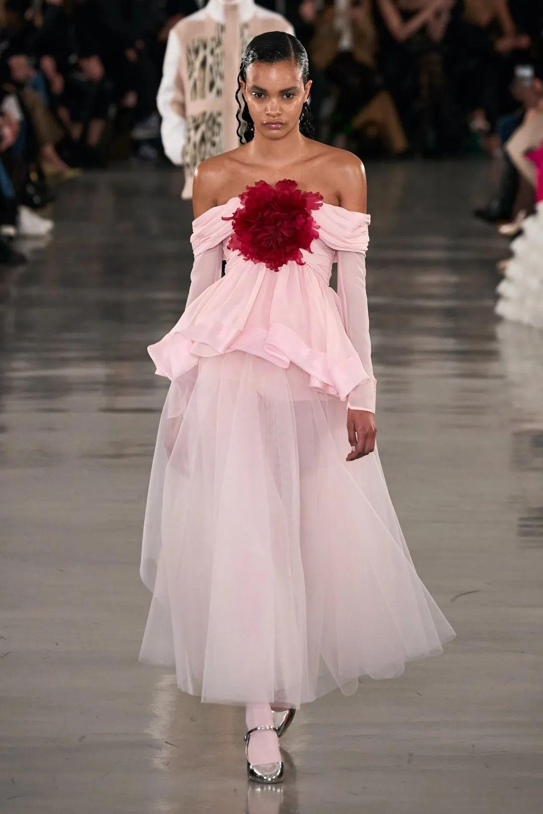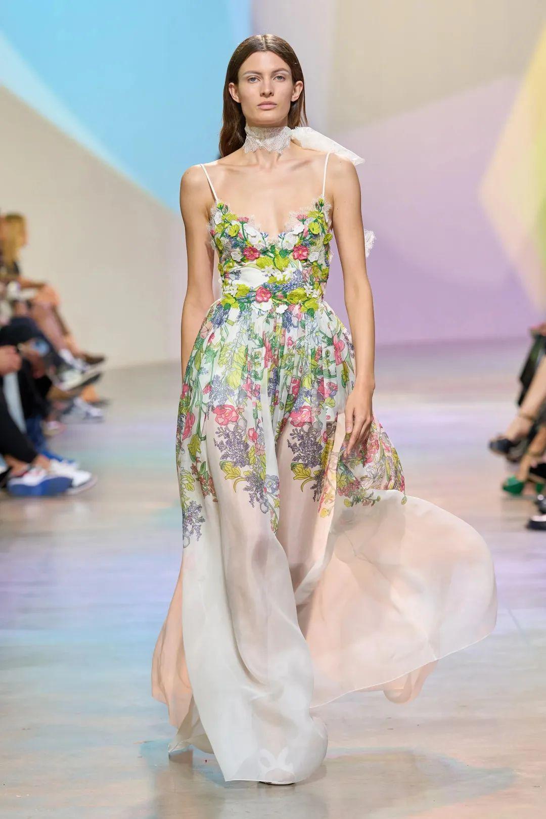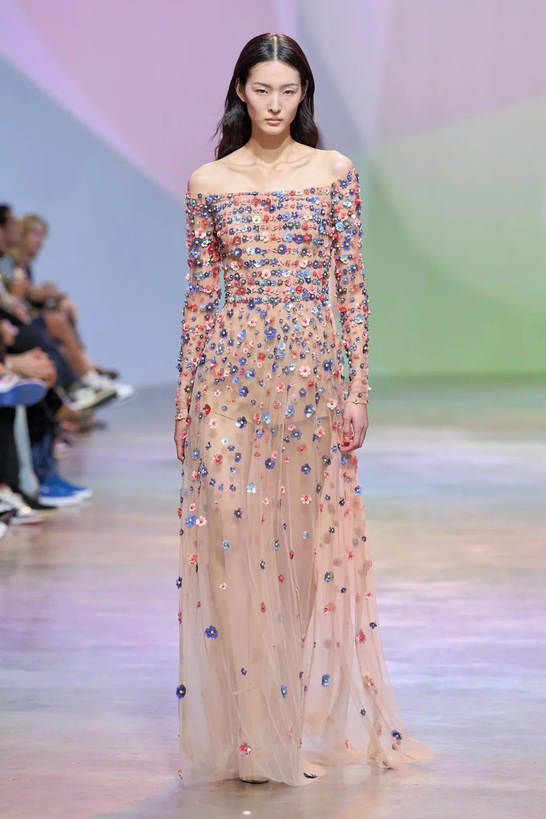 不过即便是档位降级,Elie Saab成衣系列也一如既往走着仙气飘飘的精工路线,本季呈现的亮片刺绣和立体花卉等设计依旧透露着时装屋不俗的工艺自信和高定出身的底气。