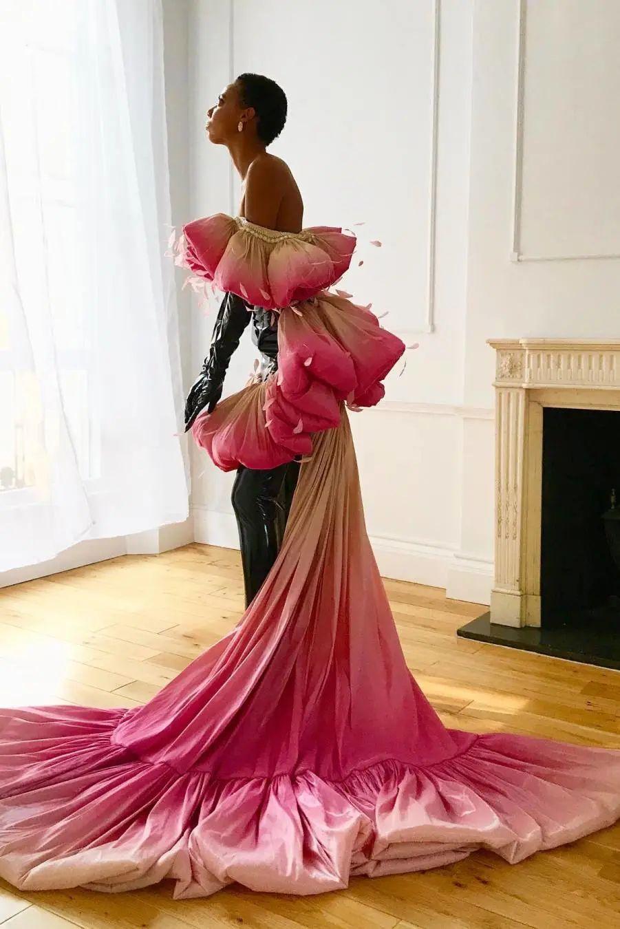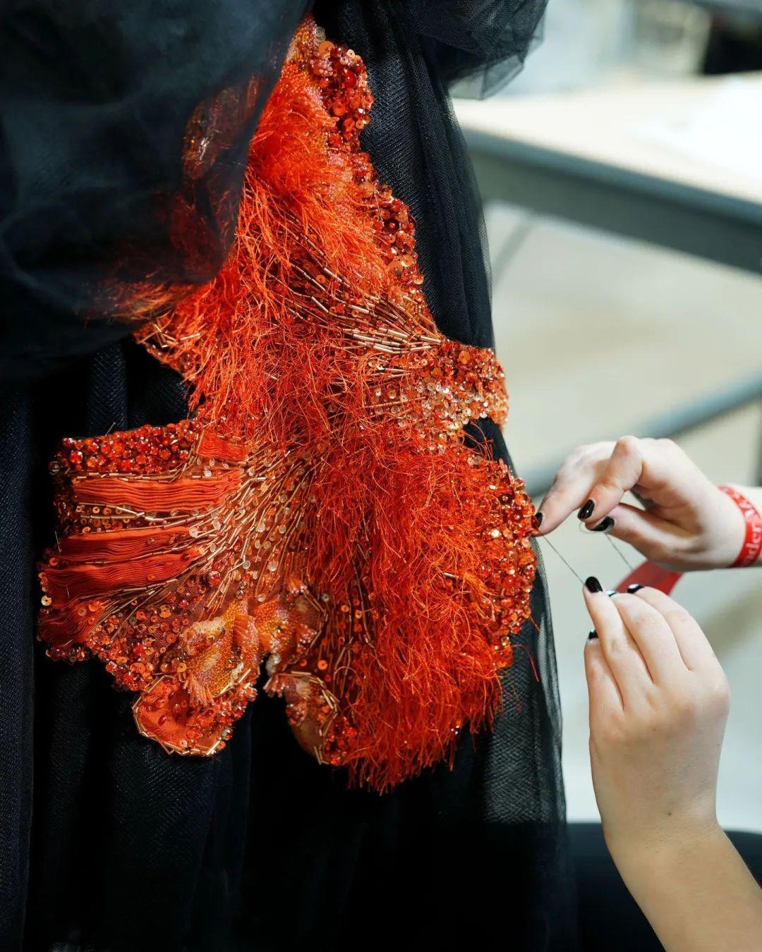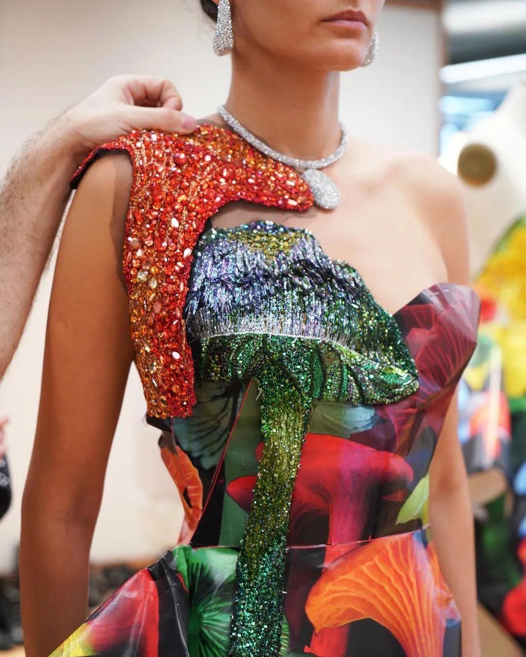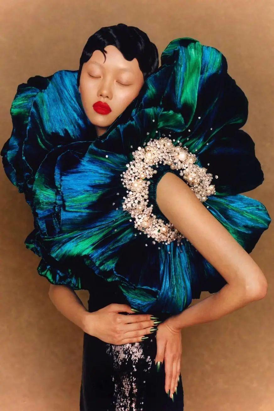 她擅长以雕塑般的廓形和光泽感面料描绘出花卉的轮廓。那些裙边出一针一线缝制的珠玉刺绣细节,近距离观察下美到窒息。