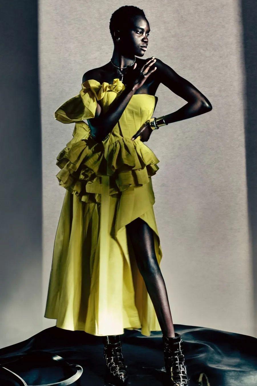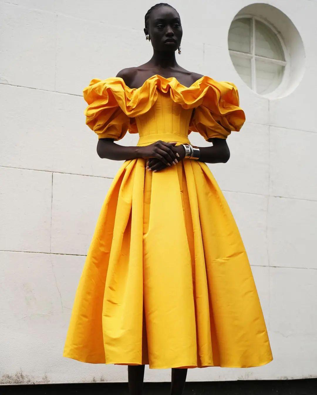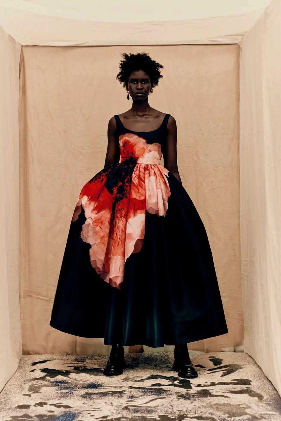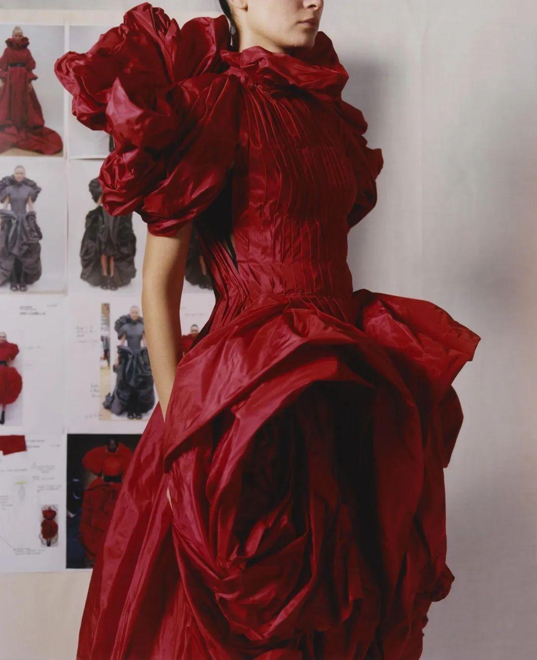 相似的塔夫绸褶皱设计几乎会在Alexander McQueen每一季回归,变幻着饱满的色彩,廓形也充满想象力。