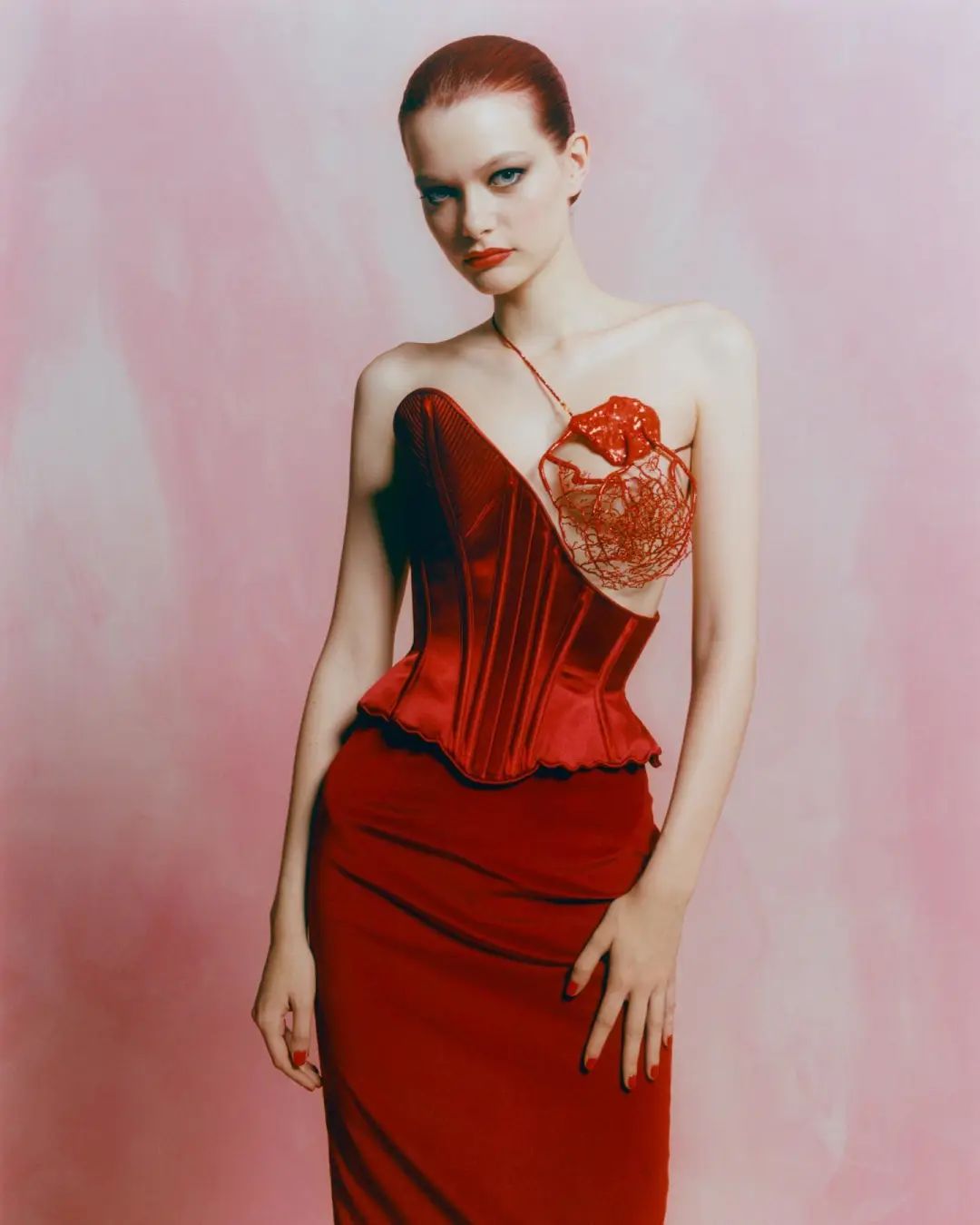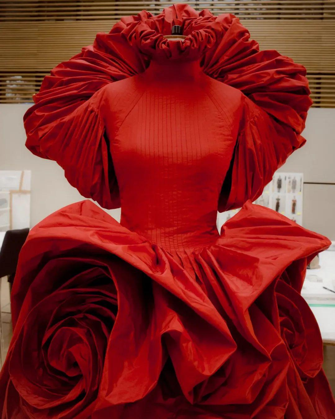2019秋冬系列中压轴登场的红玫瑰裙是Sarah Burton创造的“名场面”之一。整件裙子几乎由一块完整的塔夫绸面料一气呵成,50道细褶手工压制缝合在胸前,一路延伸出三朵鲜红色的玫瑰花蕊,在下摆绽放开,将视觉观感拉满。