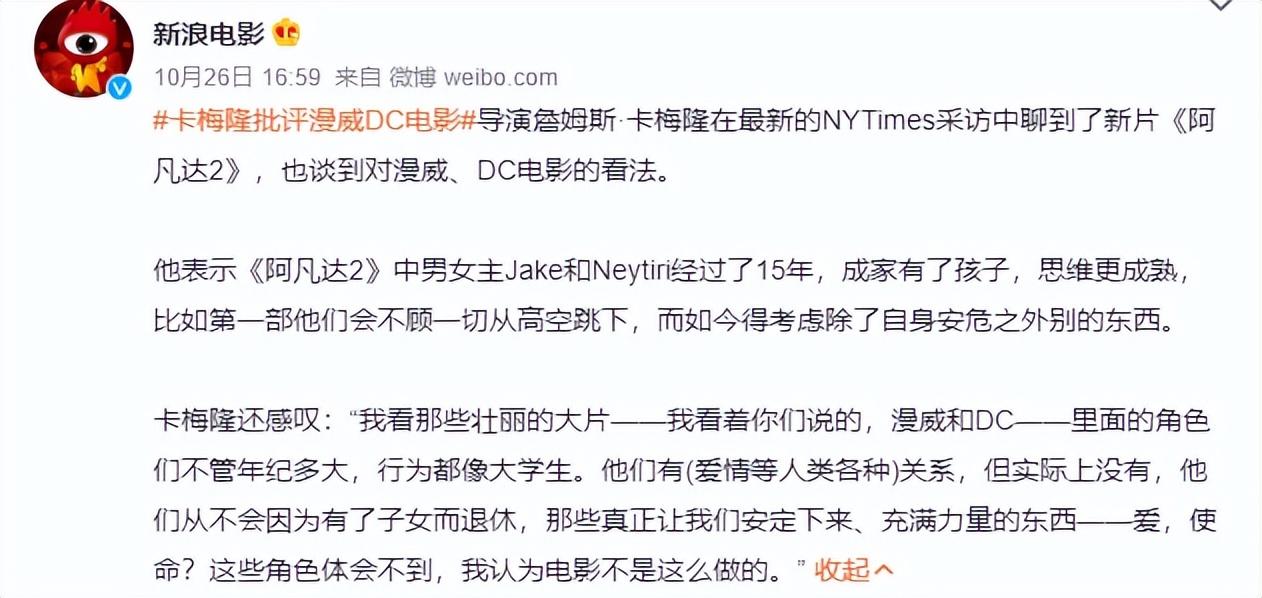 卡梅隆的意思,并非瞧不上漫威电影情感内核的俗套。