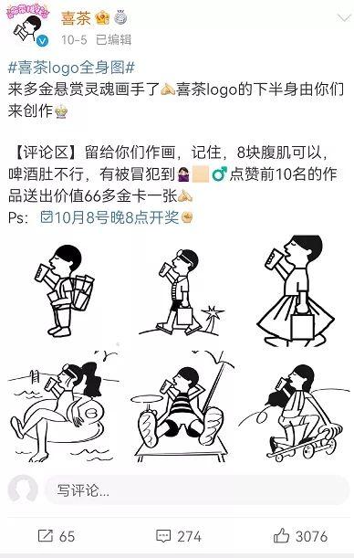 头像更新之后,喜茶随即发起了一项“阿喜全身像征集大赛”,邀请网友创作新的喜茶全身像,征集粉丝的“灵魂之作”。