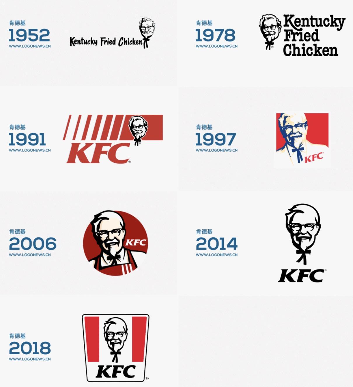 60岁的肯德基每回更新的Logo旁都印着年份,见证品牌形象随时代的变化。图像设计虽然整体变化不大,但可见近年来,Logo呈现简化的趋势。