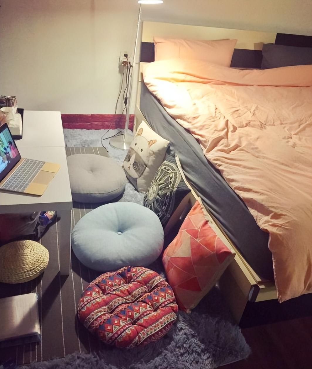 为了节省空间,我把床换成气压高箱床,衣服什么的都放在床里面。床左边铺了一块浅灰色地毯,摆几个坐垫和靠枕,从宜家买的两个白色简约小方桌拼在一起,就能放零食,饮料,还可以摆上笔记本看电影。
