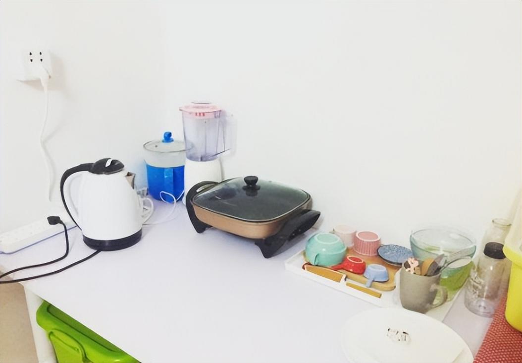进门的位置放了一张长方形的餐桌,餐桌下面放着收纳箱,放着碗筷和洗刷用具,桌子上放了一个小型的焖锅,还有一个榨汁机。由于怕有油烟,所以平时也只是做一些简单的快餐。
