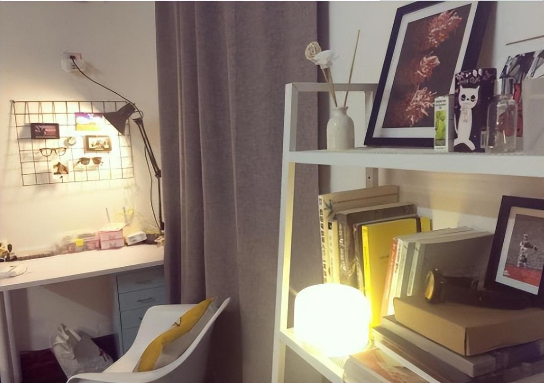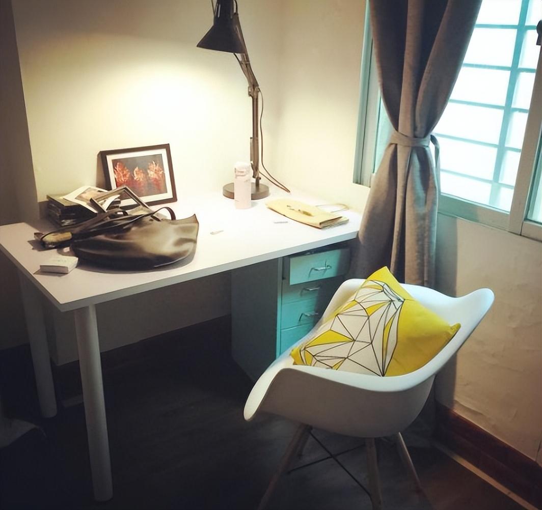 接下来就开始了装修之路,首先就是地板,买了地板革直接铺上,毕竟只有地板才能提升生活品质。在贴墙纸之前刷层基膜可以防潮。窗帘换成深灰色绒布窗帘,原先放柜子的地方我改成了书桌,桌子上放着黑色可移动台灯,搭配着宜家风格的椅子,简直是生活装×神器。