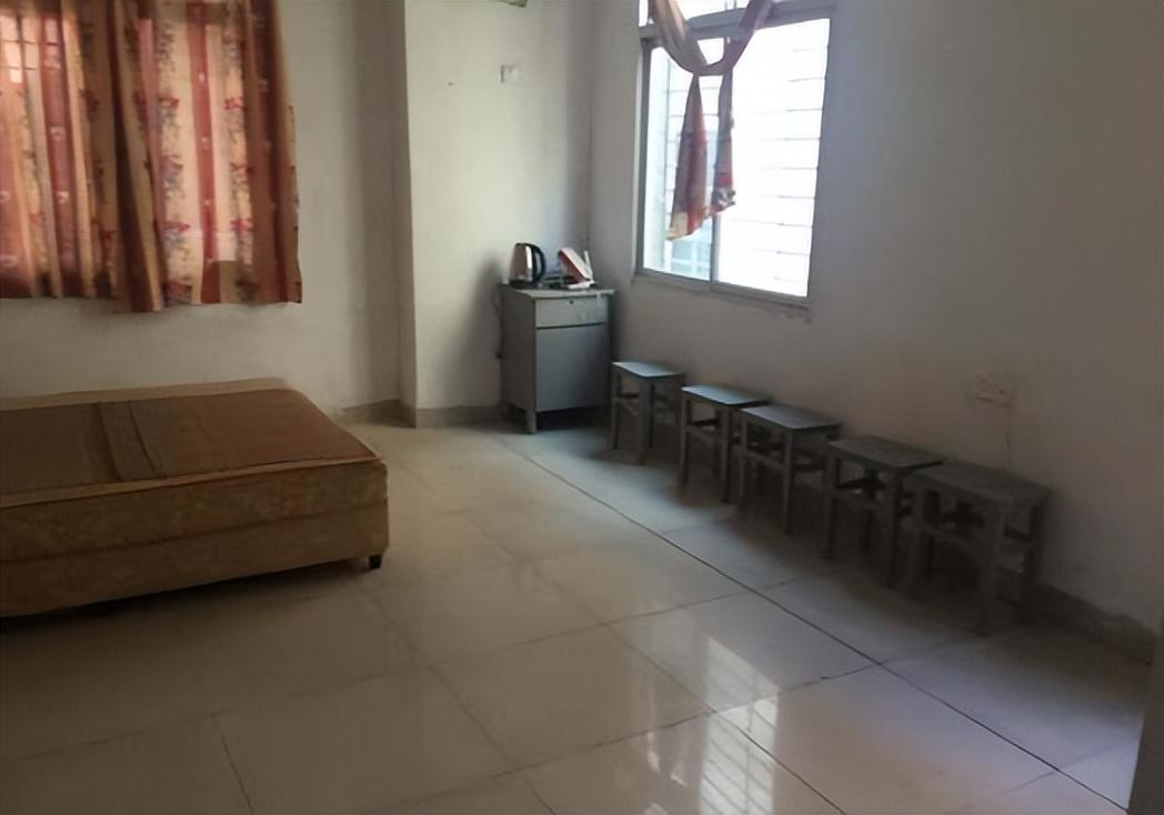 这是房东和我签合同时拍的,面积有20平。房子两侧都有窗户,采光倒不用担心,但是上世纪90年代的窗帘挂在这让我有种想扭秧歌的冲动。仅有的几件家具电器,也就是电风扇,几把椅子,一个老式的储物柜。一个电热水壶和一张床了。