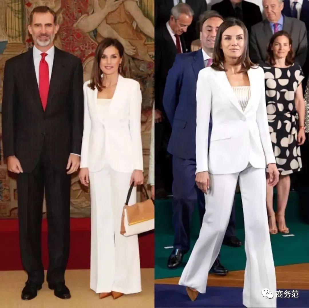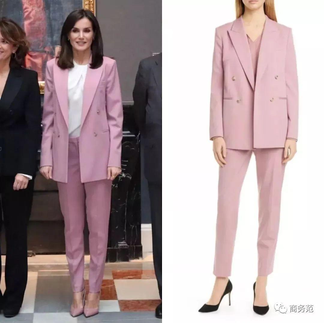 王室成员们出公务时,比较偏爱温柔色系的套装。比如西班牙王后的这套粉色套装,花瓣粉的颜色平添了一丝温婉的气质,正式又不失亲和力。