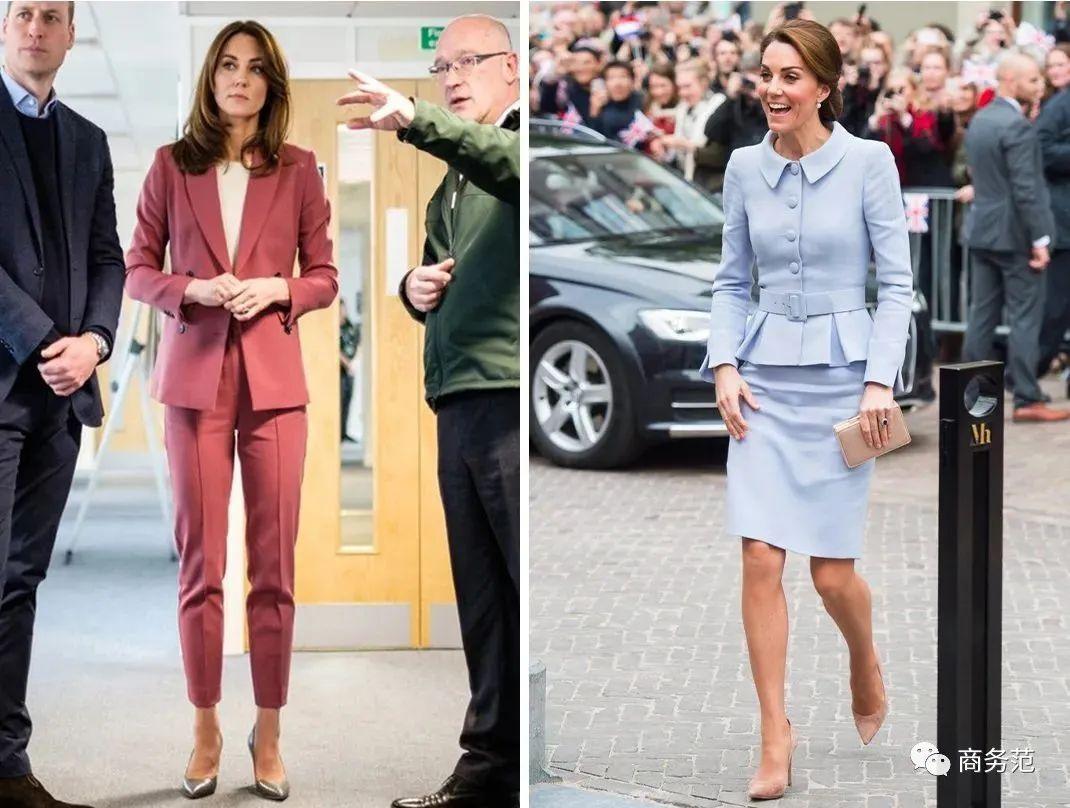 凯特穿套装也是比较青睐柔和的色彩,像下面这身玫瑰粉西服套装和浅蓝色半裙套装,显气质又温柔。