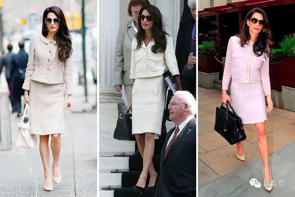 精英律师Amal Clooney经常以整套的香奈儿套装亮相,搭配大号手提包和尖头高跟鞋,优雅和职业两种风格都能轻松满足。